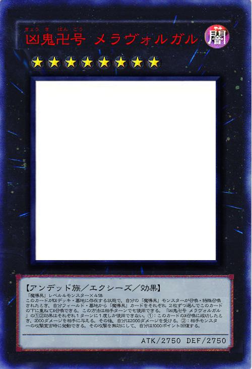| 「魔導具」レベル4モンスター×4体 このカードがEXデッキ・墓地に存在する状態で、自分の「魔導具」モンスターが召喚・特殊召喚されたとき、自分フィールド・墓地から「魔導具」カードをそれぞれ 2枚ずつ選んでこのカードの下に重ねてX召喚できる。この方法は相手ターンでも使用できる。「凶鬼卍号 メラヴォルガル」の①②効果はそれぞれ1ターンに1度しか使用できない。①:このカードのX召喚に成功したとき、2000ダメージを相手に与える。その後、自分は2000ダメージを受ける。②:相手モンスターの攻撃宣言時に発動できる。その攻撃を無効にして、自分は1000ポイント回復する。 | |||