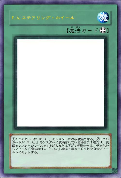 | ①:このカードは「F.A.」モンスターにのみ装備できる。②:このカードが「F.A.」モンスターに装備されている場合に1度だけ、装備モンスターのレベルを1上げるまたは下げて発動できる。デッキからフィールド魔法以外の「F.A.」魔法・罠カード1枚を自分フィールドにセットする。 | |||