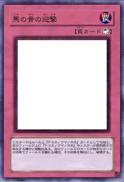 | このカードはルール上『ドコカノウマノホネ』カードとしても扱う。自分フィールド上に『ドコカノウマノホネ』モンスターが表側表示で存在する場合に発動出来る。自分フィールドのカードが相手のカードの効果でフィールドを離れる場合、その効果を無効にし、破壊する。 | |||