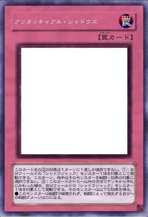 | このカード名の②の効果は1ターンに1度しか使用できない。①:自分フィールドの「シャドウジャック」モンスター1体を対象として発動できる。このターン、相手はそのモンスターを戦闘・効果の対象に選択できない。②:このカードがドロー以外の方法でデッキから手札に加わった場合、自分フィールドの「シャドウジャック」モンスター1体を対象として発動できる。そのモンスターは以下の効果を得る。●このモンスターは戦闘で破壊されず、戦闘によって発生する自分への戦闘ダメージは0になる。 | |||