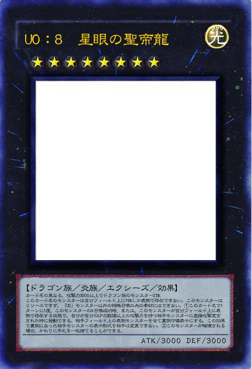 | カード名の異なる、攻撃力3000以上でドラゴン族のモンスター2体 このカード名のモンスターは自分フィールド上に1体しか表側で存在できない。このモンスターはリリースできず、「UO」モンスター以外の特殊召喚の為の素材にはできない。①このカード名で1ターンに1度、このモンスターのX召喚成功時、または、このモンスターが自分フィールド上に表側で存在する状態で、自分が自分のLPの数値以上の攻撃力を持つ相手モンスターに直接攻撃宣言された時に発動できる。相手フィールド上の表側モンスターを全て裏側守備表示にする。この効果で裏側になった相手モンスターの表示形式を相手は変更できない。②このモンスターが破壊される場合、かわりに手札を一枚捨てることができる。 | |||