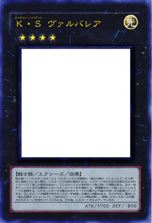 | 戦士族・レベル4モンスター×2 このカードのX召喚時に「真なる騎士 ヴァルバレア」をX素材に使用していない場合、このカードの効果は無効になる。このカード名の①②の効果はそれぞれ1ターンに1度しか使用出来ない。①このカードのX素材を一つ取り除いて発動出来る。自分・相手フィールドまたは墓地からモンスターカード1枚を選択して、装備魔法カード扱いとしてこのカードに装備する。このモンスターの攻撃力はそのカードの攻撃力か守備力の高い方の数値分アップする。②このカードが戦闘で相手モンスターを破壊した場合に発動出来る。自分の手札・墓地から「真なる騎士 ヴァルバレア」1体を自分フィールド上に特殊召喚し、破壊したモンスターの攻撃力分のダメージを相手ライフに与える。その後、このカードをEXデッキに戻す。 | |||