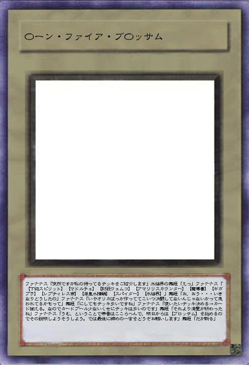 | ファナナス「突然ですが私の持ってるデッキをご紹介します」氷結界の舞姫「えっ」ファナナス「【下級スピリット】【マドルチェ】【封殺ウェムコ】【アマリリスカウンター】【魔導書】【ギガプラ】【レプティレス帝】【海皇水精鱗】【スパイダー】【氷結界】」舞姫「お、おう・・・いきなりどうしたの」ファナナス「いやオリカばっか作っててこいつ決闘してないんじゃないかって思われてるかもって」舞姫「にしてもデッキ多いですね」ファナナス「使いたいデッキ決める→カード揃える。なのでカードプール少ないくせにデッキは多いのです」舞姫「それより海霊が終わったね」ファナナス「うむ、ということで茶番はここらへんで、明日からは【ブロッサム】を始めるのでその説明しようそうしよう。では最後に締めの一言をどうぞお願いします」舞姫「だが断る」 | |||