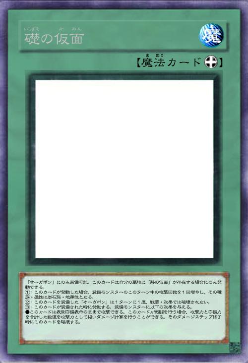 | 「オーガポン」にのみ装備可能。このカードは自分の墓地に「碧の仮面」が存在する場合にのみ発動できる。 ①:このカードが発動した場合、装備モンスターのこのターン中の攻撃回数を1回増やし、その種族・属性は岩石族・地属性となる。 ②:このカードを装備した「オーガポン」は1ターンに1度、戦闘・効果では破壊されない。 ③:このカードが装備された時に発動する。装備モンスターに以下の効果を与える。 ●このカードは表側守備表示のままで攻撃できる。このカードが戦闘を行う場合、攻撃力と守備力を合計した数値を攻撃力として扱いダメージ計算を行うことができる。そのダメージステップ終了時にこのカードを破壊する。 | |||