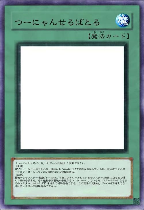 | 「つーにゃんせるばとる」は1ターンに1枚しか発動できない。 【条件】 自分フィールド上にモンスター(獣族/レベル4以下)が1体のみ存在しているか、自分がモンスターをコントロールしていない場合にのみ発動できる。 【効果】 墓地からモンスター(獣族/レベル4以下)をコントロールしているモンスターが2体になるまで選んで特殊召喚する。その後相手は墓地か手札からコントロールしているモンスターが2体になるまでモンスター(レベル4以下)を選んで特殊召喚できる。この効果の発動後、ターン終了時まで自分はモンスターを特殊召喚できない。 | |||