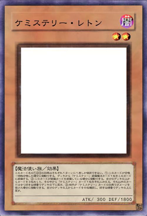 | このカード名の①②③の効果はそれぞれ1ターンに1度しか使用できない。①:このカードが召喚・特殊召喚した場合に発動できる。デッキから「ケミステリー」装備魔法カード1枚をこのカードに装備する。②:このカードが装備カードを装備している場合に発動できる。自分のデッキの上からカードを3枚めくり、その中から「ケミステリー」カード1枚を手札に加える。それ以外のカードは全て好きな順番でデッキの下に戻す。③:相手が「ケミステリー」カードの効果でダメージを受けた場合に発動できる。自分のデッキの上からカードを6枚確認し、好きな順番でデッキの上に戻す。 | |||