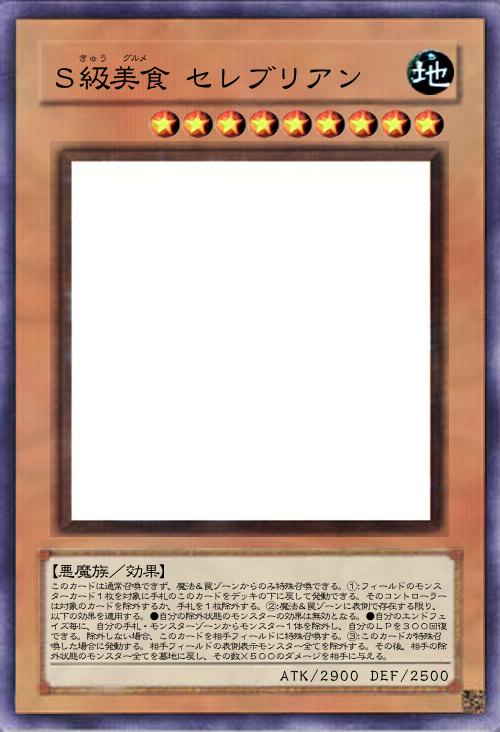 | このカードは通常召喚できず、魔法&罠ゾーンからのみ特殊召喚できる。①:フィールドのモンスターカード1枚を対象に手札のこのカードをデッキの下に戻して発動できる。そのコントローラーは対象のカードを除外するか、手札を1枚除外する。②:魔法&罠ゾーンに表側で存在する限り、以下の効果を適用する。●自分の除外状態のモンスターの効果は無効となる。●自分のエンドフェイズ毎に、自分の手札・モンスターゾーンからモンスター1体を除外し、自分のLPを300回復できる。除外しない場合、このカードを相手フィールドに特殊召喚する。③:このカードが特殊召喚した場合に発動する。相手フィールドの表側表示モンスター全てを除外する。その後、相手の除外状態のモンスター全てを墓地に戻し、その数×500のダメージを相手に与える。 | |||