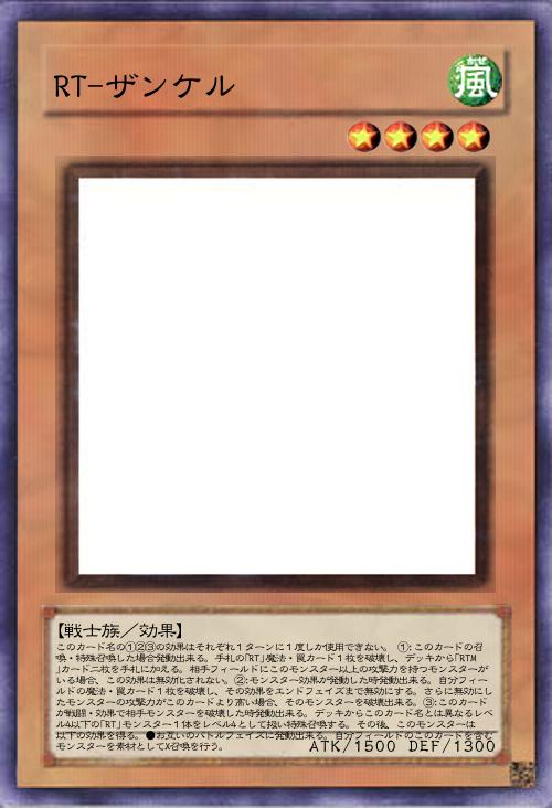 | このカード名の①②③の効果はそれぞれ1ターンに1度しか使用できない。 ①:このカードの召喚・特殊召喚した場合発動出来る。手札の「RT」魔法・罠カード1枚を破壊し、デッキから「RTM」カード二枚を手札に加える。相手フィールドにこのモンスター以上の攻撃力を持つモンスターがいる場合、この効果は無効化されない。②:モンスター効果が発動した時発動出来る。自分フィールドの魔法・罠カード1枚を破壊し、その効果をエンドフェイズまで無効にする。さらに無効にしたモンスターの攻撃力がこのカードより高い場合、そのモンスターを破壊出来る。③:このカードが戦闘・効果で相手モンスターを破壊した時発動出来る。デッキからこのカード名とは異なるレベル4以下の「RT」モンスター1体をレベル4として扱い特殊召喚する。その後、このモンスターは以下の効果を得る。●お互いのバトルフェイズに発動出来る。自分フィールドのこのカードを含むモンスターを素材としてX召喚を行う。 | |||