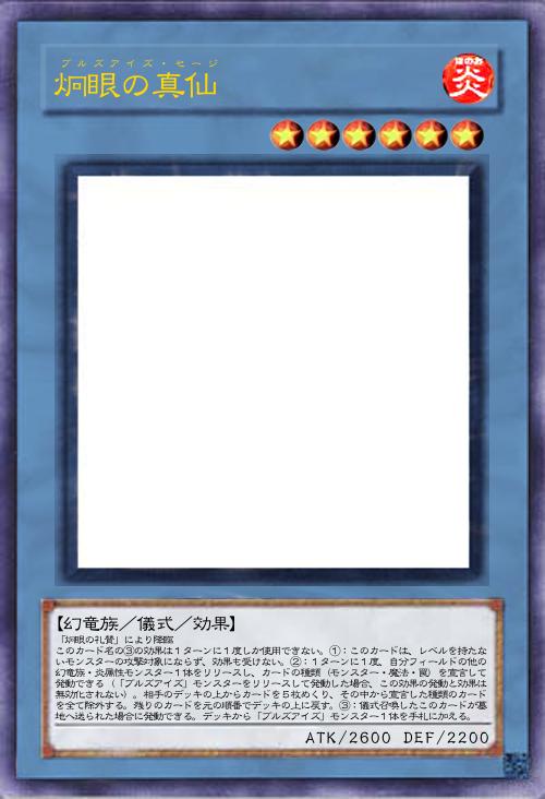 | 「炯眼の礼賛」により降臨 このカード名の③の効果は1ターンに1度しか使用できない。①:このカードは、レベルを持たないモンスターの攻撃対象にならず、効果も受けない。②:1ターンに1度、自分フィールドの他の幻竜族・炎属性モンスター1体をリリースし、カードの種類(モンスター・魔法・罠)を宣言して発動できる(「ブルズアイズ」モンスターをリリースして発動した場合、この効果の発動と効果は無効化されない)。相手のデッキの上からカードを5枚めくり、その中から宣言した種類のカードを全て除外する。残りのカードを元の順番でデッキの上に戻す。③:儀式召喚したこのカードが墓地へ送られた場合に発動できる。デッキから「ブルズアイズ」モンスター1体を手札に加える。 | |||