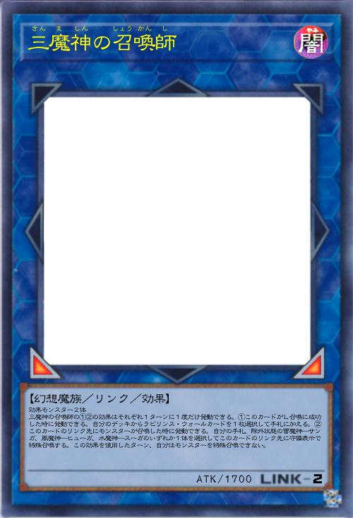 | 効果モンスター2体 三魔神の召喚師の①②の効果はそれぞれ1ターンに1度だけ発動できる。①このカードがL召喚に成功した時に発動できる。自分のデッキからラビリンス・ウォールカードを1枚選択して手札に加える。②このカードのリンク先にモンスターが召喚した時に発動できる。自分の手札、除外状態の雷魔神―サンガ、風魔神―ヒューガ、水魔神―スーガのいずれか1体を選択してこのカードのリンク先に守備表示で特殊召喚する。この効果を使用したターン、自分はモンスターを特殊召喚できない。 | |||