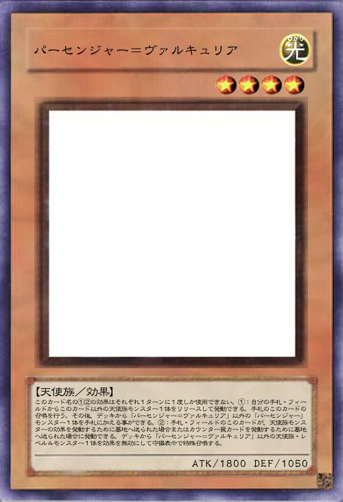 | このカード名の①②の効果はそれぞれ1ターンに1度しか使用できない。①:自分の手札・フィールドからこのカード以外の天使族モンスター1体をリリースして発動できる。手札のこのカードの召喚を行う。その後、デッキから「パーセンジャー=ヴァルキュリア」以外の「パーセンジャー」モンスター1体を手札に加える事ができる。②:手札・フィールドのこのカードが、天使族モンスターの効果を発動するために墓地へ送られた場合またはカウンター罠カードを発動するために墓地へ送られた場合に発動できる。デッキから「パーセンジャー=ヴァルキュリア」以外の天使族・レベル4モンスター1体を効果を無効にして守備表示で特殊召喚する。 | |||