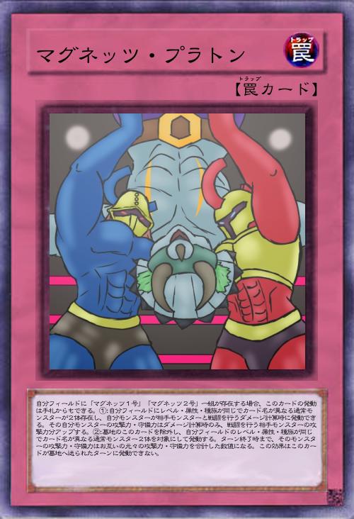 | 自分フィールドに「マグネッツ1号」「マグネッツ2号」一組が存在する場合、このカードの発動は手札からもできる。①:自分フィールドにレベル・属性・種族が同じでカード名が異なる通常モンスターが2体存在し、自分モンスターが相手モンスターと戦闘を行うダメージ計算時に発動できる。その自分モンスターの攻撃力・守備力はダメージ計算時のみ、戦闘を行う相手モンスターの攻撃力分アップする。②:墓地のこのカードを除外し、自分フィールドのレベル・属性・種族が同じでカード名が異なる通常モンスター2体を対象にして発動する。ターン終了時まで、そのモンスターの攻撃力・守備力はお互いの元々の攻撃力・守備力を合計した数値になる。この効果はこのカードが墓地へ送られたターンに発動できない。 | |||