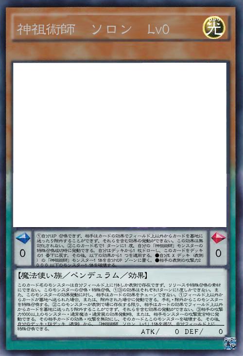 | このカード名のモンスターは自分フィールド上に1体しか表側で存在できず、リリースや特殊召喚の素材にできない。このモンスターの召喚・特殊召喚、①③の効果はそれぞれ1ターンに1度しかできない。また、このモンスターの効果発動に対し、相手はカードの効果をチェーンできない。①フィールド上以外からカードが墓地へ送られた場合、または、除外された場合に発動できる。手札・除外からこのモンスターを特殊召喚する。②このモンスターが表側で場に存在する限り、相手はカードの効果でフィールド上以外からカードを墓地に送ったり除外することができず、それらを含む効果の発動ができない。③相手の攻撃力1000以上のモンスター・通常魔法・通常罠の効果発動時、または、相手モンスターの攻撃宣言時に発動できる。その相手カードの効果・攻撃を無効にし、そのカードとこのモンスターを破壊する。その後、自分のデッキ・EXデッキ(表側)から、「神祖術師 ソロン Lv1」1体を選び、自分フィールド上に特殊召喚できる。 | |||