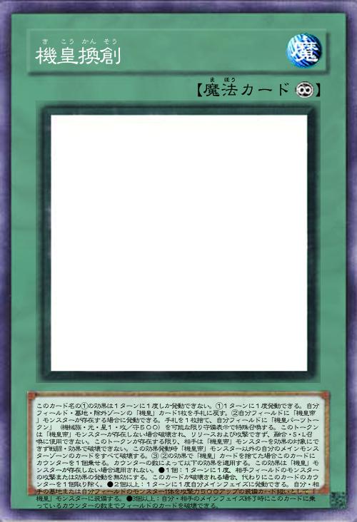 | このカード名の①の効果は1ターンに1度しか発動できない。①1ターンに1度発動できる。自分フィールド・墓地・除外ゾーンの「機皇」カード1枚を手札に戻す。②自分フィールドに「機皇帝」モンスターが存在する場合に発動できる。手札を1枚捨て、自分フィールドに「機皇パーツトークン」(機械族・光・星1・攻/守500)を可能な限り守備表示で特殊召喚する。このトークンは「機皇帝」モンスターが存在しない場合破壊され、リリースおよび攻撃できず、融合・S・L召喚に使用できない。このトークンが存在する限り、相手は「機皇帝」モンスターを効果の対象にできず戦闘・効果で破壊できない。この効果発動時「機皇帝」モンスター以外の自分のメインモンスターゾーンのカードをすべて破壊する。③ ②の効果で「機皇」カードを捨てた場合このカードにカウンターを1個乗せる。カウンターの数によって以下の効果を適用する。この効果は「機皇」モンスターが存在しない場合適用されない。●1個:1ターンに1度、相手フィールドのモンスターの攻撃または効果の発動を無効にする。このカードが破壊される場合、代わりにこのカードのカウンターを1個取り除く。●2個以上:1ターンに1度自分メインフェイズに発動できる。自分・相手の墓地または自分フィールドのモンスター1体を攻撃力500アップの装備カード扱いとして「機皇」モンスターに装備する。●3個以上:自分・相手のメインフェイズ終了時にこのカードに乗っているカウンターの数までフィールドのカードを破壊できる。 | |||