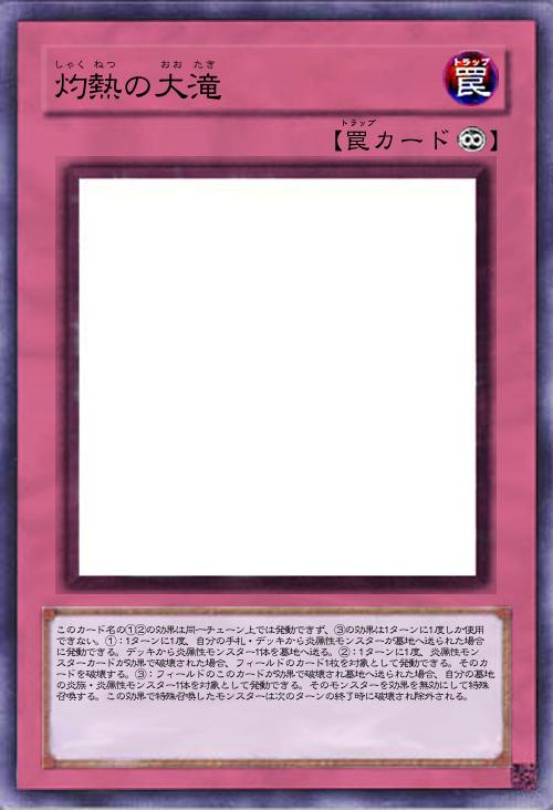 | このカード名の①②の効果は同一チェーン上では発動できず、③の効果は1ターンに1度しか使用できない。①:1ターンに1度、自分の手札・デッキから炎属性モンスターが墓地へ送られた場合に発動できる。デッキから炎属性モンスター1体を墓地へ送る。②:1ターンに1度、炎属性モンスターカードが効果で破壊された場合、フィールドのカード1枚を対象として発動できる。そのカードを破壊する。③:フィールドのこのカードが効果で破壊され墓地へ送られた場合、自分の墓地の炎族・炎属性モンスター1体を対象として発動できる。そのモンスターを効果を無効にして特殊召喚する。この効果で特殊召喚したモンスターは次のターンの終了時に破壊され除外される。 | |||
