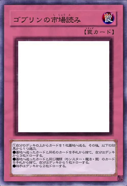 | ①自分のデッキの上からカードを1枚墓地へ送る。その後、以下の効果から1つ選ぶ。 ●墓地へ送ったカードと同名のカードを手札から捨て、自分はデッキから3枚ドローする。 ●墓地へ送ったカードと同じ種類(モンスター・魔法・罠)のカードを手札から捨て、自分はデッキから1枚ドローする。 ●相手はデッキから2枚ドローする。 | |||