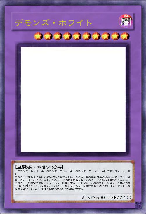 「デモンズ・レッド」+「デモンズ・ブルー」+「デモンズ・グリーン」+「デモンズ・コマンド」 このカードは融合召喚以外では特殊召喚できない。このカードの融合召喚に成功した時、フィールド上のカード1枚を除外する。このカードを融合召喚するためのカードの効果は無効化されない。このカードの攻撃力は自分フィールド上に存在する「デモンズ」と名のつくモンスター1体につき、300ポイントアップする。このカードがフィールド上を離れた時、墓地から「デモンズ」と名のつく融合モンスター1体を融合召喚扱いで特殊召喚する。 |