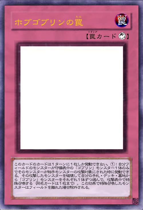 | このカードのカードは1ターンに1枚しか発動できない。①:自分フィールドのモンスターが守備表示の「ゴブリン」モンスター1体のみでそのモンスターが相手モンスターの攻撃対象にされた時に発動できる。その攻撃したモンスターを破壊して自分の手札・デッキ・墓地から「ゴブリン」モンスターをそれぞれ1体ずつ選んで、攻撃表示で特殊召喚する(同名カードは1枚まで)。この効果で特殊召喚したモンスターはフィールドを離れた場合除外される。 | |||