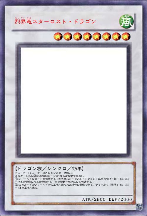 | チューナー+チューナー以外のモンスター1体以上 このカード名の②の効果は1ターンに1度しか発動できない。 ①:フィールドのカードを破壊する「烈界竜スターロスト・ドラゴン」以外の魔法・罠・モンスター効果が発動したとき発動する、その発動を無効にして破壊する。 ②:このカードがフィールドから墓地へ送られた場合に発動できる、デッキから「烈界」モンスター1体を墓地へ送る。 | |||