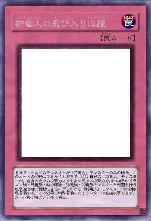 | 自分フィールドのモンスターが「狩竜人」モンスターのみの場合、このカードの発動は手札からもできる。①:自分の「狩竜人」モンスターが、自身の元々の攻撃力よりも高い元々の攻撃力を持つ相手のドラゴン族・恐竜族・爬虫類族・海竜族・幻竜族モンスターと戦闘を行う攻撃宣言時に発動できる。デッキから「狩竜人」モンスター1体を特殊召喚する。この効果で特殊召喚したモンスターは直接攻撃できず、ターン終了時にデッキに戻る。 | |||