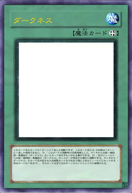 | このカード名のカードは1ターンに1枚しか発動できず、このカード名の(2)の効果は1ターンに1度しか使用できない。(1):このカードの発動時の効果処理として、デッキから水族・植物族・悪魔族の「ダークネス」モンスター1体を手札に加える事ができる。(2):自分フィールドに水族・植物族・悪魔族の「ダークネス」モンスターが存在する場合に発動できる。デッキから「ダークネス」のカード名が記された永続罠カードを5枚まで選んで自分フィールドにセットする(同名カードは1枚まで)。そのカードは全て次のターンのエンドフェイズに破壊される。 | |||