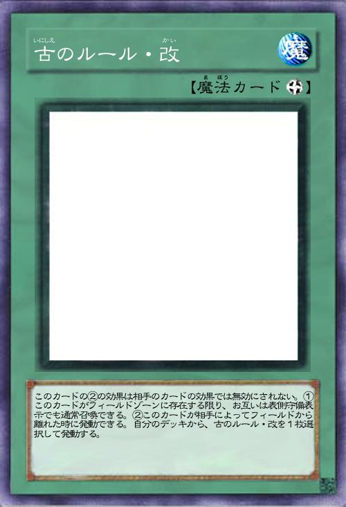 | このカードの②の効果は相手のカードの効果では無効にされない。①このカードがフィールドゾーンに存在する限り、お互いは表側守備表示でも通常召喚できる。②このカードが相手によってフィールドから離れた時に発動できる。自分のデッキから、古のルール・改を1枚選択して発動する。 | |||