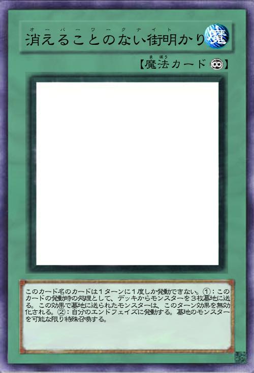| このカード名のカードは1ターンに1度しか発動できない。①:このカードの発動時の処理として、デッキからモンスターを3枚墓地に送る。この効果で墓地に送られたモンスターは、このターン効果を無効化される。②:自分のエンドフェイズに発動する。墓地のモンスターを可能な限り特殊召喚する。 | |||
