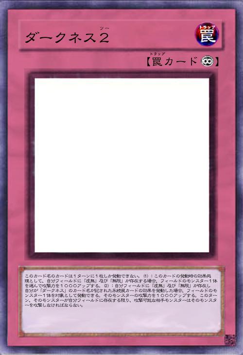 | このカード名のカードは1ターンに1枚しか発動できない。(1):このカードの発動時の効果処理として、自分フィールドに「虚無」及び「無限」が存在する場合、フィールドのモンスター1体を選んで攻撃力を1000アップする。(2):自分フィールドに「虚無」及び「無限」が存在し自分が「ダークネス」のカード名が記された永続罠カードの効果を発動した場合、フィールドのモンスター1体を対象として発動できる。そのモンスターの攻撃力を1000アップする。このターン、そのモンスターが自分フィールドに存在する限り、攻撃可能な相手モンスターはそのモンスターを攻撃しなければならない。 | |||