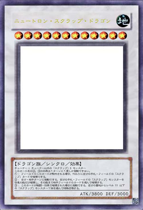| チューナー + チューナー以外の「スクラップ」S モンスター このカード名の②、③の効果は1ターンに1度しか発動できない。 ① : フィールドのこのカードが除外される場合、代わりに自分の手札・フィールドの「スクラップ」カード1枚を破壊できる。 ② : 自分・相手ターンに発動できる。自分の手札・フィールドの「スクラップ」モンスターを任意の数だけ破壊し、その数まで相手フィールドのカードを選んで破壊する。 ③ : このカードが戦闘・効果で破壊された場合に発動できる。自分の墓地からレベル 11 以下の「スクラップ」モンスター1体を選んで特殊召喚する。 | |||