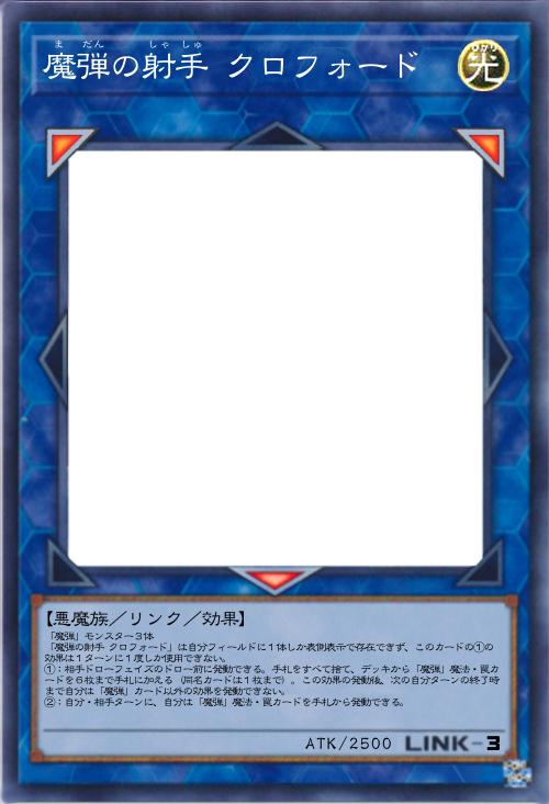 | 「魔弾」モンスター3体 「魔弾の射手 クロフォード」は自分フィールドに1体しか表側表示で存在できず、このカードの①の効果は1ターンに1度しか使用できない。 ①:相手ドローフェイズのドロー前に発動できる。手札をすべて捨て、デッキから「魔弾」魔法・罠カードを6枚まで手札に加える(同名カードは1枚まで)。この効果の発動後、次の自分ターンの終了時まで自分は「魔弾」カード以外の効果を発動できない。 ②:自分・相手ターンに、自分は「魔弾」魔法・罠カードを手札から発動できる。 | |||