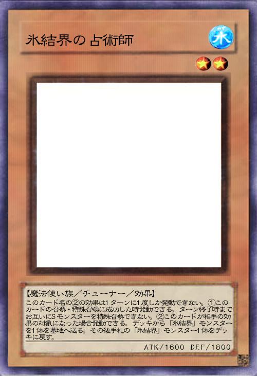 | このカード名の②の効果は1ターンに1度しか発動できない。①このカードの召喚・特殊召喚に成功した時発動できる。ターン終了時までお互いにSモンスターを特殊召喚できない。②このカードが相手の効果の対象になった場合発動できる。デッキから「氷結界」モンスターを1体を墓地へ送る。その後手札の「氷結界」モンスター1体をデッキに戻す。 | |||