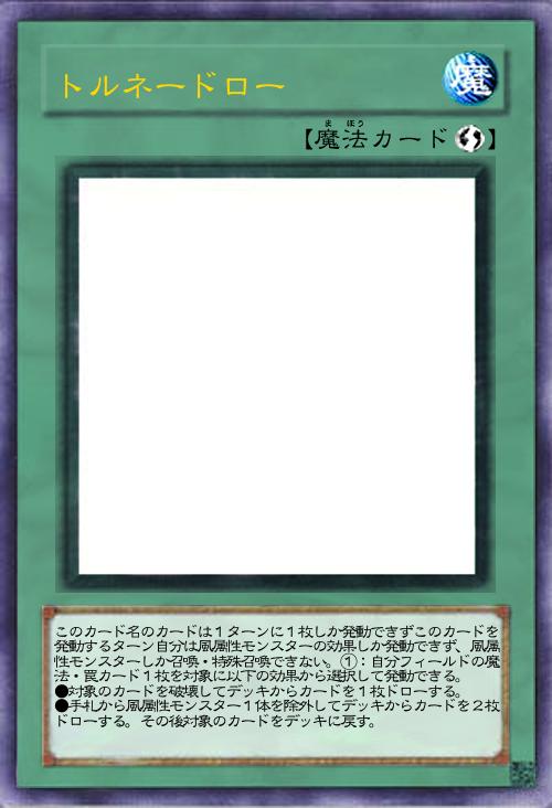 | このカード名のカードは1ターンに1枚しか発動できずこのカードを発動するターン自分は風属性モンスターの効果しか発動できず、風属性モンスターしか召喚・特殊召喚できない。①:自分フィールドの魔法・罠カード1枚を対象に以下の効果から選択して発動できる。 ●対象のカードを破壊してデッキからカードを1枚ドローする。 ●手札から風属性モンスター1体を除外してデッキからカードを2枚ドローする。その後対象のカードをデッキに戻す。 | |||