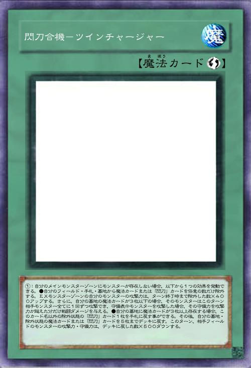 | ①:自分のメインモンスターゾーンにモンスターが存在しない場合、以下から1つの効果を発動できる。●自分のフィールド・手札・墓地から魔法カードまたは「閃刀」カードを任意の数だけ除外する。EXモンスターゾーンの自分のモンスターの攻撃力は、ターン終了時まで除外した数×400アップする。さらに、自分の墓地の魔法カードが3枚以下の場合、そのモンスターはこのターン相手モンスター全てに1回ずつ攻撃でき、守備表示モンスターを攻撃した場合、その守備力を攻撃力が超えた分だけ戦闘ダメージを与える。●自分の墓地に魔法カードが3枚以上存在する場合、このカード名以外の除外状態の「閃刀」カード1枚を手札に戻す事ができる。その後、自分の墓地・除外状態の魔法カードまたは「閃刀」カードを5枚までデッキに戻す。このターン、相手フィールドのモンスターの攻撃力・守備力は、デッキに戻した数×500ダウンする。 | |||