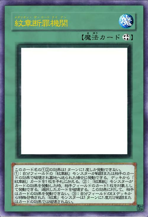 | このカード名の①②の効果は1ターンに1度しか発動できない。 ①:自分フィールドの「紋章獣」モンスターが戦闘または相手のカードの効果で破壊され墓地へ送られた場合に発動できる。デッキから「紋章獣」カードを1枚を手札に加える。②:「紋章獣」モンスターがカードの効果を発動した時、相手フィールドのカード1枚を対象として発動できる。選択したカードを破壊する。この効果に対して、相手はカードの効果を発動できない。③:自分フィールドのEXデッキから特殊召喚された「紋章」モンスターは1ターンに1度だけ戦闘またはカードの効果では破壊されない。 | |||