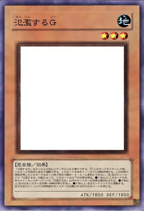 | 「氾濫するG」はルール上4枚以上デッキに入れる事もできる。①:このカードをドローした時、このカードを相手に見せて発動できる。このカードを相手フィールドに特殊召喚する。この効果で特殊召喚したこのカードはターン終了時まで融合・S・X・L素材にできない。②:自分フィールドの「氾濫するG」の数によって、このカードは以下の効果を得る。●1体以上:このカードの左右のメインモンスターゾーンの「氾濫するG」以外のモンスターの効果は無効化される。●3体以上:自分はモンスターを召喚・特殊召喚できない。●5体以上:自分エンドフェイズに発動する。自分は自分フィールドの表側表示モンスターの攻撃力の合計分のダメージを受ける。 | |||