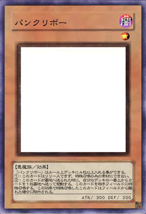 | 「パンクリボー」はルール上デッキに4枚以上入れる事ができる。 ①:このカードはリリースできず、特殊召喚の為の素材にできない。 ②:このカードが墓地へ送られた時に、自分のデッキの一番上からカードを1枚墓地へ送って発動する。このカードを相手フィールドに特殊召喚する。この効果で特殊召喚したこのカードはフィールドから離れた場合に除外される。 | |||