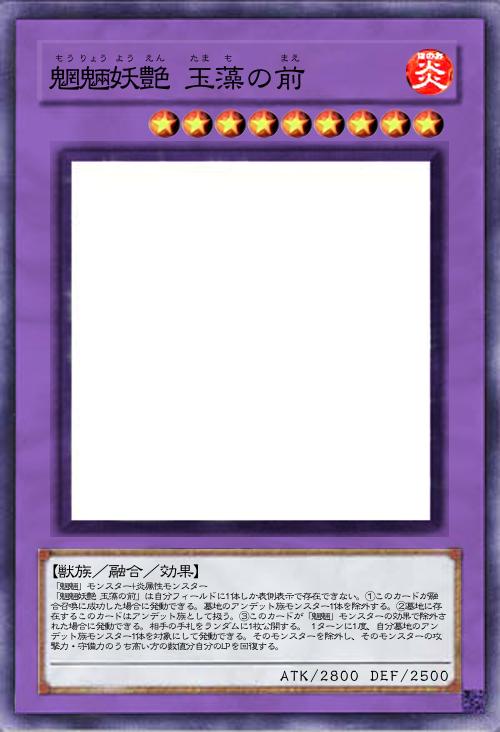 | 「魍魎」モンスター+炎属性モンスター 「魍魎妖艶 玉藻の前」は自分フィールドに1体しか表側表示で存在できない。①このカードが融合召喚に成功した場合に発動できる。墓地のアンデット族モンスター1体を除外する。②墓地に存在するこのカードはアンデット族として扱う。③このカードが「魍魎」モンスターの効果で除外された場合に発動できる。相手の手札をランダムに1枚公開する。➃1ターンに1度、自分墓地のアンデット族モンスター1体を対象にして発動できる。そのモンスターを除外し、そのモンスターの攻撃力・守備力のうち高い方の数値分自分のLPを回復する。 | |||
