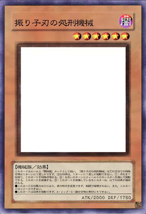| このカードはルール上「撃鉄龍」カードとして扱い、「振り子刃の処刑機械」は①の方法での特殊召喚は1ターンに1度しかできず、②の効果は、1ターンに1度しか発動できない。①:手札を1枚捨て、このカードを特殊召喚する。②:お互いのターンにフィールドのモンスターを選んで発動できる。このカードを装備する。③:このカードを装備しているモンスターは、以下の効果が適用される。 ●このカードの攻撃力は0になり、表示形式を変更できず、戦闘で破壊されない。また、このカードはリリースできない。 ●このカードは効果を発動できず、X・リンク・S・融合召喚の素材にもできない。 | |||