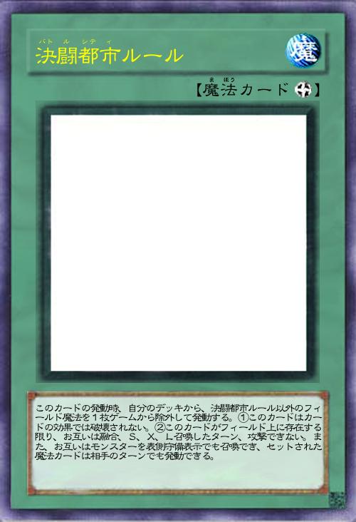 | このカードの発動時、自分のデッキから、決闘都市ルール以外のフィールド魔法を1枚ゲームから除外して発動する。①このカードはカードの効果では破壊されない。②このカードがフィールド上に存在する限り、お互いは融合、S、X、L召喚したターン、攻撃できない。また、お互いはモンスターを表側守備表示でも召喚でき、セットされた魔法カードは相手のターンでも発動できる。 | |||