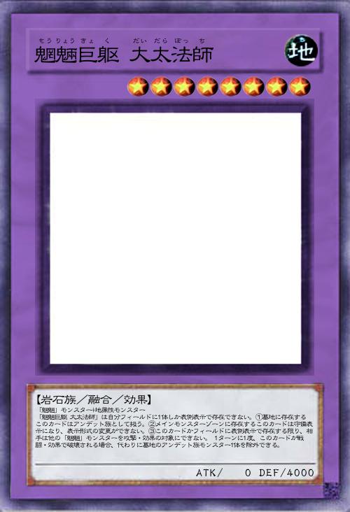 | 「魍魎」モンスター+地属性モンスター 「魍魎巨躯 大太法師」は自分フィールドに1体しか表側表示で存在できない。①墓地に存在するこのカードはアンデット族として扱う。②メインモンスターゾーンに存在するこのカードは守備表示になり、表示形式の変更ができない。③このカードかフィールドに表側表示で存在する限り、相手は他の「魍魎」モンスターを攻撃・効果の対象にできない。➃1ターンに1度、このカードが戦闘・効果で破壊される場合、代わりに墓地のアンデット族モンスター1体を除外できる。 | |||