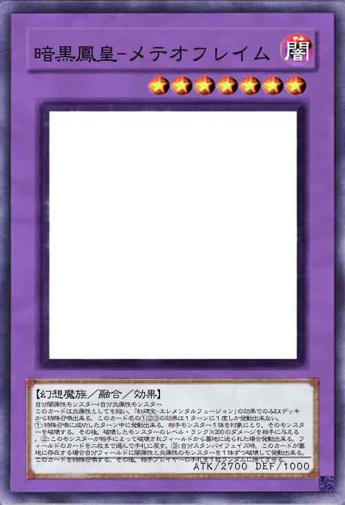 | 自分闇属性モンスター+自分炎属性モンスター このカードは炎属性としても扱い、「虹碑宝-エレメンタルフュージョン」の効果でのみEXデッキから特殊召喚出来る。このカード名の①②③の効果は1ターンに1度しか発動出来ない。 ①:特殊召喚に成功したターン中に発動出来る。相手モンスター1体を対象にとり、そのモンスターを破壊する。その後、破壊したモンスターのレベル・ランク×200のダメージを相手に与える。②:このモンスターが相手によって破壊されフィールドから墓地に送られた場合発動出来る。フィールドのカードを二枚まで選んで手札に戻す。③:自分スタンバイフェイズ時、このカードが墓地に存在する場合自分フィールドに闇属性と炎属性のモンスターを1体ずつ破壊して発動出来る。このカードを特殊召喚する。その後、相手プレイヤーの手札を1枚ランダムに捨てさせる。 | |||