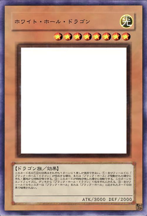| このカード名の①②の効果はそれぞれ1ターンに1度しか使用できない。①:自分フィールドに「ブラック・ホール・ドラゴン」が存在する場合、または「ブラック・ホール」が発動された場合に手札・墓地から特殊召喚できる。②:このカードが特殊召喚した場合に発動できる。このターンのエンドフェイズに、デッキから「ブラック・ホール・ドラゴン」1枚を手札に加える。③:自分フィールドのモンスターは「ブラック・ホール」または「ブラック・ホール」と記されたカードの効果で破壊されない。 | |||