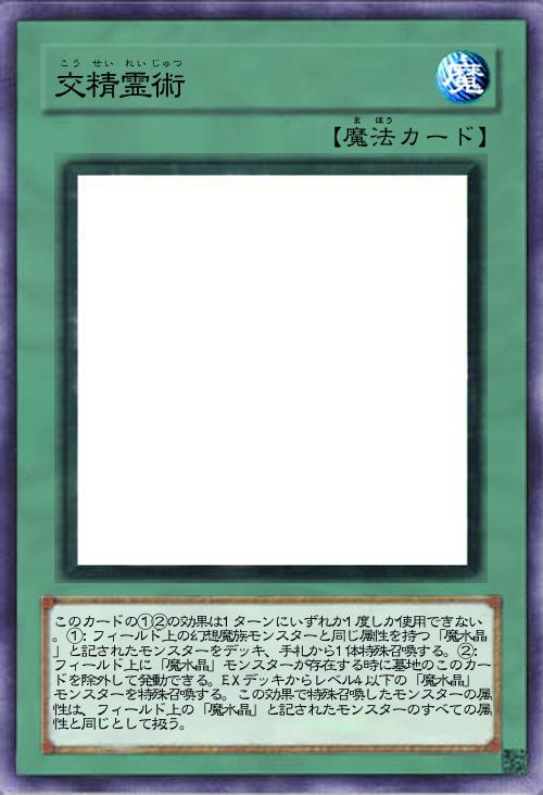 | このカードの①②の効果は1ターンにいずれか1度しか使用できない。①:フィールド上の幻想魔族モンスターと同じ属性を持つ「魔水晶」と記されたモンスターをデッキ、手札から1体特殊召喚する。②:フィールド上に「魔水晶」モンスターが存在する時に墓地のこのカードを除外して発動できる。EXデッキからレベル4以下の「魔水晶」モンスターを特殊召喚する。この効果で特殊召喚したモンスターの属性は、フィールド上の「魔水晶」と記されたモンスターのすべての属性と同じとして扱う。 | |||