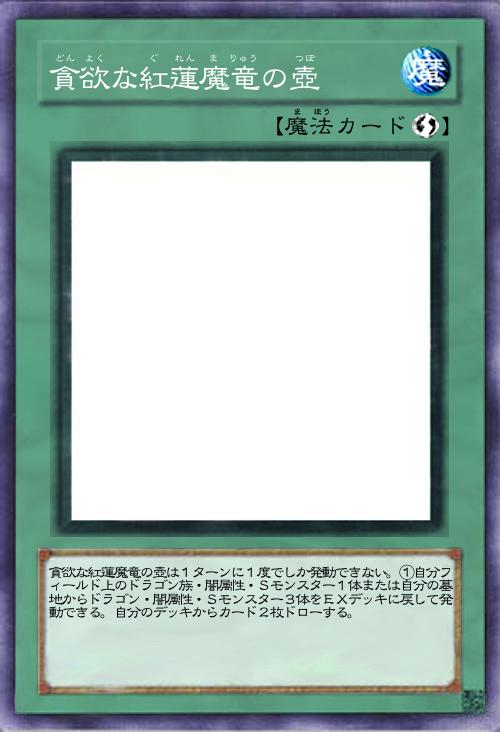| 貪欲な紅蓮魔竜の壺は1ターンに1度でしか発動できない。①自分フィールド上のドラゴン族・闇属性・Sモンスター1体または自分の墓地からドラゴン・闇属性・Sモンスター3体をEXデッキに戻して発動できる。自分のデッキからカード2枚ドローする。 | |||