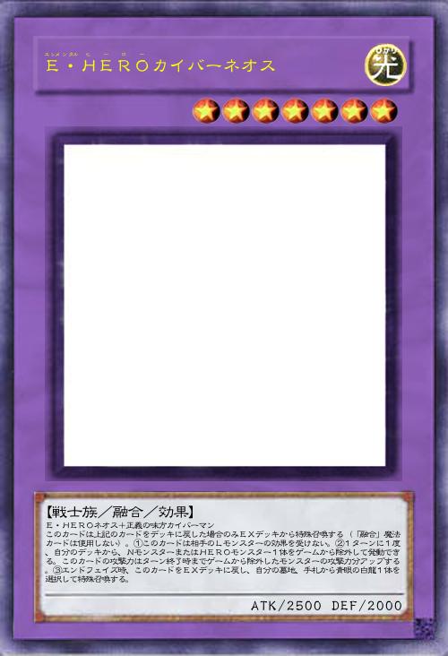 | E・HEROネオス+正義の味方カイバーマン このカードは上記のカードをデッキに戻した場合のみEXデッキから特殊召喚する(「融合」魔法カードは使用しない)。①このカードは相手のLモンスターの効果を受けない。②1ターンに1度、自分のデッキから、NモンスターまたはHEROモンスター1体をゲームから除外して発動できる。このカードの攻撃力はターン終了時までゲームから除外したモンスターの攻撃力分アップする。③エンドフェイズ時、このカードをEXデッキに戻し、自分の墓地、手札から青眼の白龍1体を選択して特殊召喚する。 | |||
