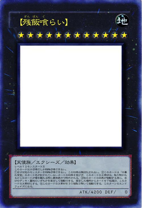 | レベル12モンスター×5 このカードはX召喚でしか特殊召喚できない。 ①自分は他のモンスターを特殊召喚できない。この効果は無効化されない。②このカードは「日暮れ食堂」のカード名が記されていないカードの効果を受けず、このカードのX素材は、取り除かれるかこのカードが場を離れる際に裏側表示で除外される。③他のカードの効果が発動する度に、自分のデッキ・墓地のいずれかを宣言して発動できる。宣言した場所からカードを7枚選び、このカードのX素材とする。④このカードのX素材を30個取り除いて発動できる。このターンのエンドフェイズになる。 | |||