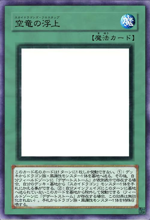| このカード名のカードは1ターンに1枚しか発動できない。①:デッキからドラゴン族・風属性モンスター1体を墓地へ送る。その後、自分フィールドゾーンに「デザートストーム」が表側表示で存在する場合、自分のデッキ・墓地から「スカイドラゴン」モンスター1体を手札に加える事ができる。②:自分メインフェイズにこのターンに墓地へ送られていないこのカードを墓地から除外して発動できる(フィールドゾーンに「デザートストーム」が存在する場合、この効果は無効化されない)。手札からドラゴン族・風属性モンスター1体を特殊召喚する。 | |||