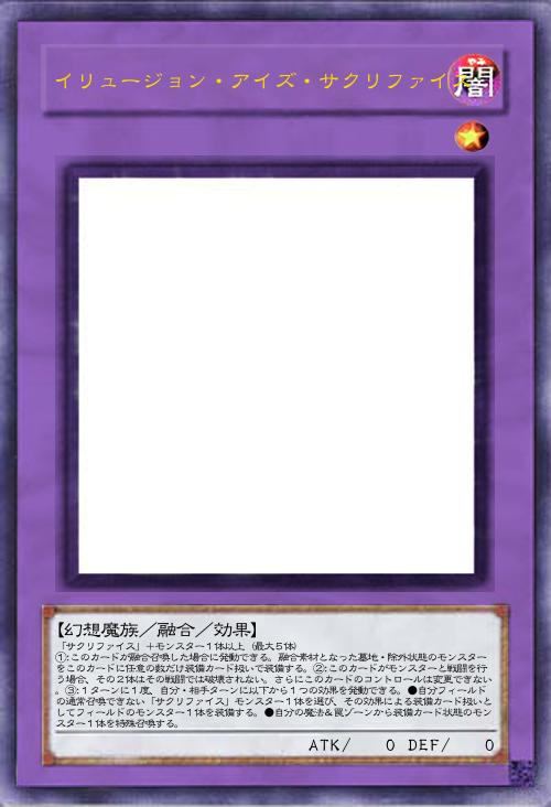 | 「サクリファイス」+モンスター1体以上(最大5体) ①:このカードが融合召喚した場合に発動できる。融合素材となった墓地・除外状態のモンスターをこのカードに任意の数だけ装備カード扱いで装備する。②:このカードがモンスターと戦闘を行う場合、その2体はその戦闘では破壊されない。さらにこのカードのコントロールは変更できない。③:1ターンに1度、自分・相手ターンに以下から1つの効果を発動できる。●自分フィールドの通常召喚できない「サクリファイス」モンスター1体を選び、その効果による装備カード扱いとしてフィールドのモンスター1体を装備する。●自分の魔法&罠ゾーンから装備カード状態のモンスター1体を特殊召喚する。 | |||