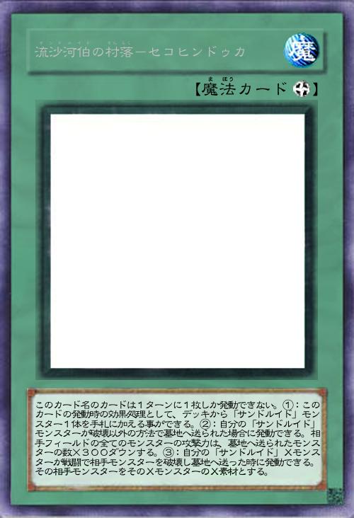 | このカード名のカードは1ターンに1枚しか発動できない。①:このカードの発動時の効果処理として、デッキから「サンドルイド」モンスター1体を手札に加える事ができる。②:自分の「サンドルイド」モンスターが破壊以外の方法で墓地へ送られた場合に発動できる。相手フィールドの全てのモンスターの攻撃力は、墓地へ送られたモンスターの数×300ダウンする。③:自分の「サンドルイド」Xモンスターが戦闘で相手モンスターを破壊し墓地へ送った時に発動できる。その相手モンスターをそのXモンスターのX素材とする。 | |||