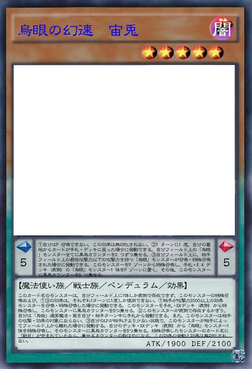 | このカード名のモンスターは、自分フィールド上に1体しか表側で存在できず、このモンスターの特殊召喚および、①③の効果は、それぞれ1ターンに1度しか使用できない。①相手が攻撃力2000以上の効果モンスターを召喚・特殊召喚した場合に発動できる。このモンスターを手札・EXデッキ(表側)から特殊召喚し、このモンスターに黒烏カウンターを5つ乗せる。②このモンスターが表側で存在するかぎり、自分は「烏術」通常魔法・罠を自分・相手ターン中に手札から発動できる。また、このモンスターは相手の攻撃・効果の対象にならない。③自分のLPが相手LPより少ない状態で、このモンスターが相手によってフィールド上から離れた場合に発動する。自分のデッキ・EXデッキ(表側)から「烏眼」モンスター1体を特殊召喚し、そのモンスターに黒烏カウンターを5つ乗せる。特殊召喚したモンスターのカード名に「新月」が含まれていたなら、乗せるカウンターの数は10になる。この効果の発動と効果は無効化されない。 | |||